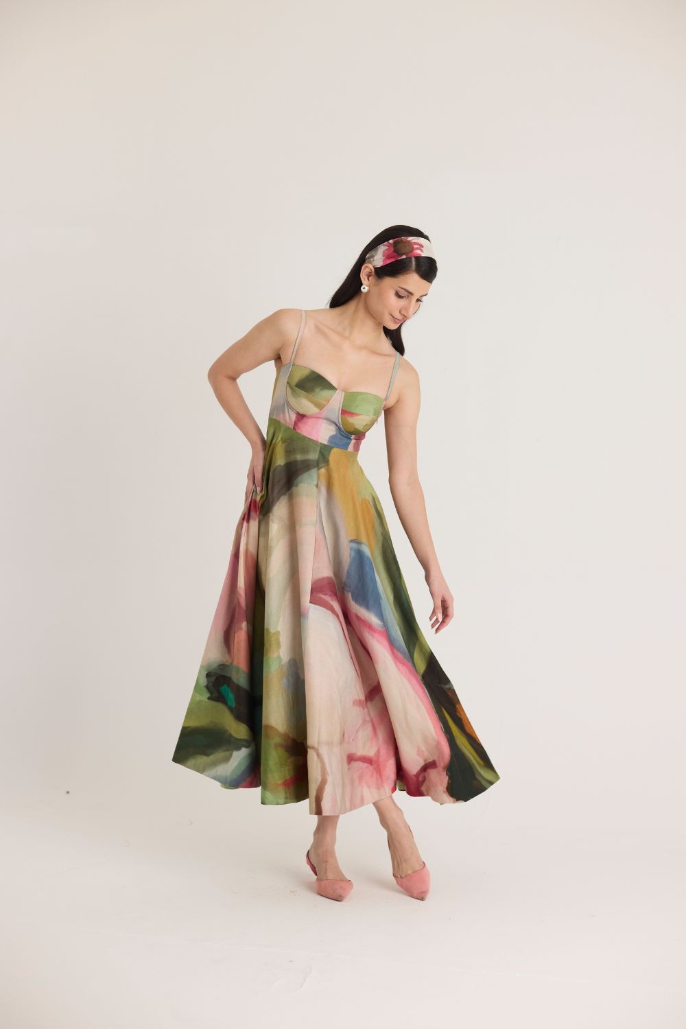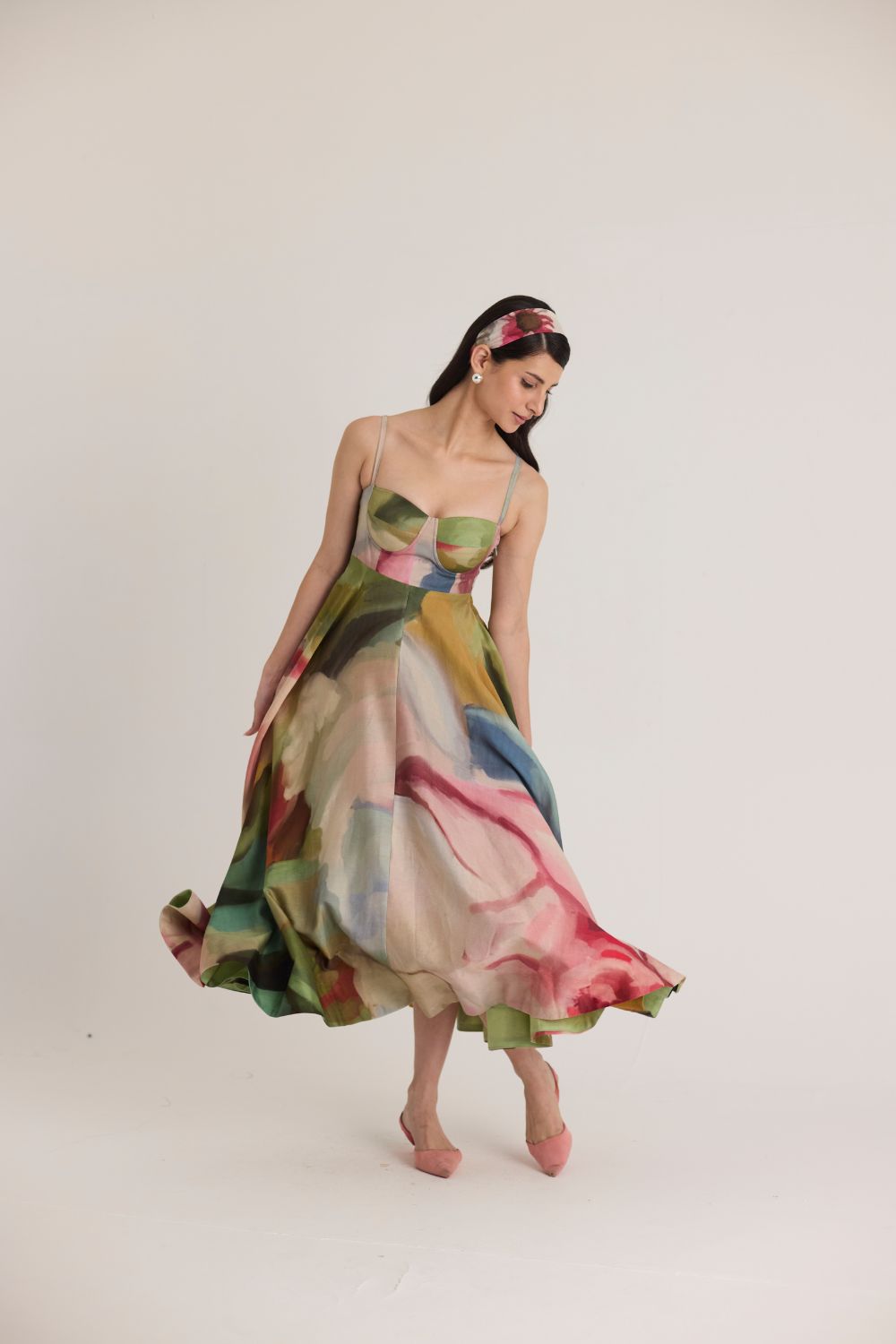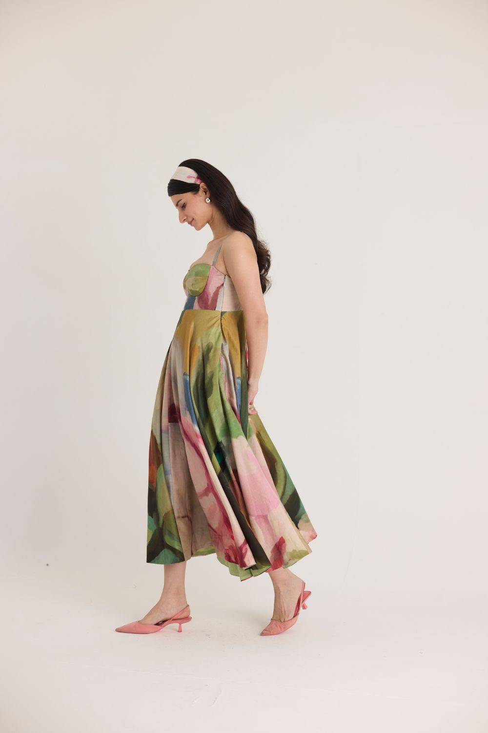 The dress showcases a breathtaking watercolor-inspired print, blending vibrant hues of green, pink, blue, and hints of ochre. The artistic brushstroke effect mimics a hand-painted floral canvas, exuding a dreamy, romantic aesthetic.